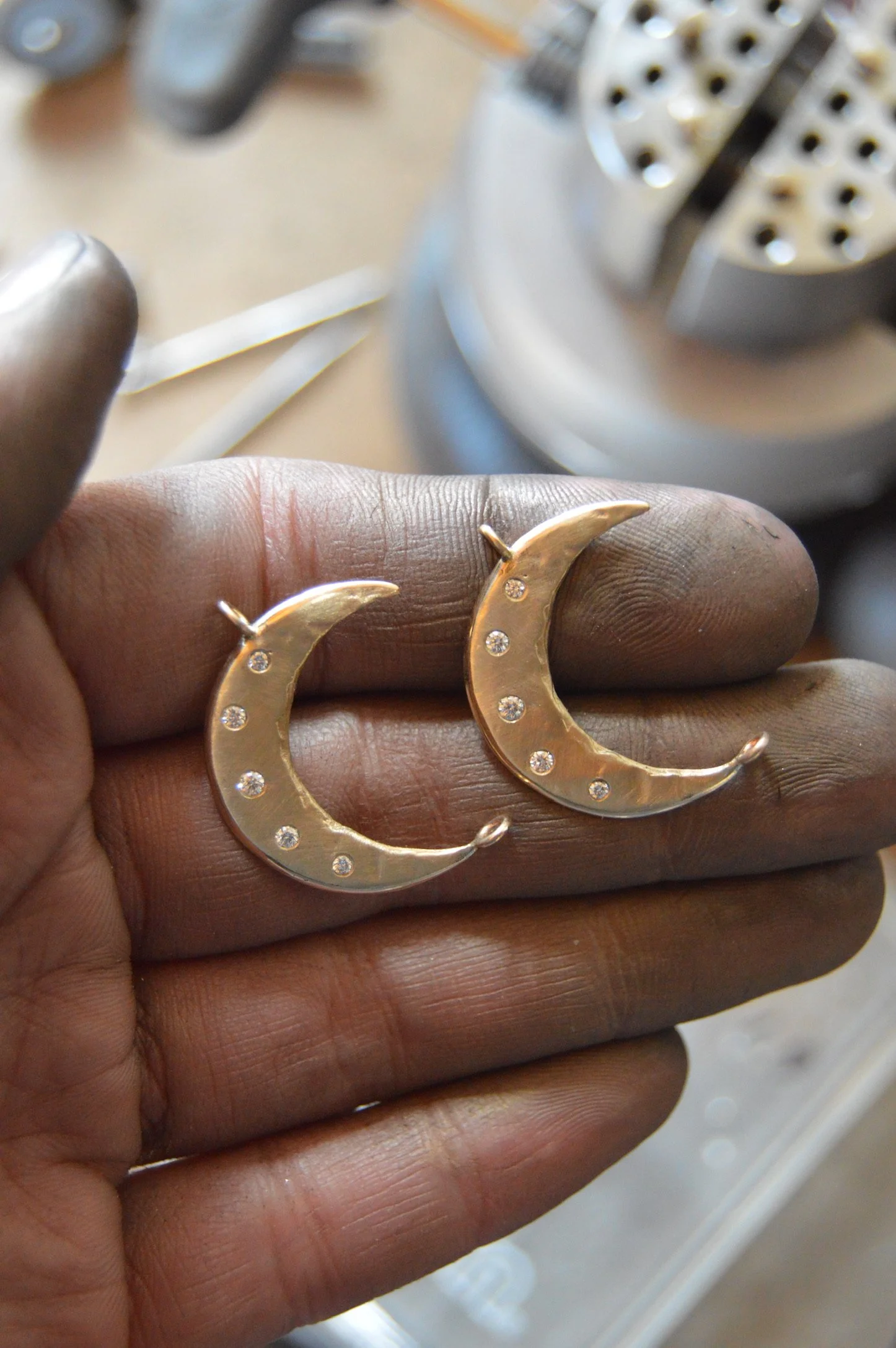 Hannah soldering gold bezels for Lunarian Necklaces.