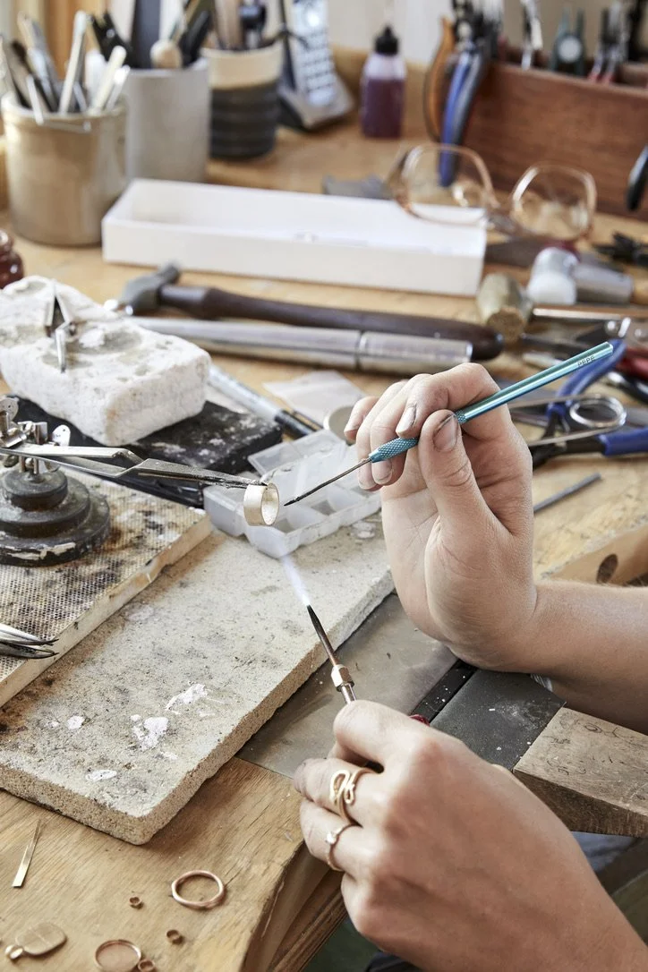 From forming the bezel, to soldering, stone setting, engraving, and finally the polishing stage, each piece is made by Hannah, herself. Our only outsourced process is wax casting which is carried out by an experienced, family-run casting house in New York.